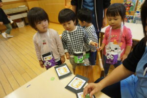 すみれ組さんは自分で作ったモンスターバッグを持ってゲームに挑戦。