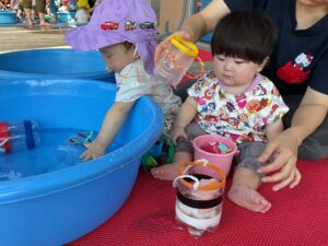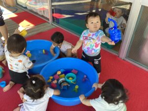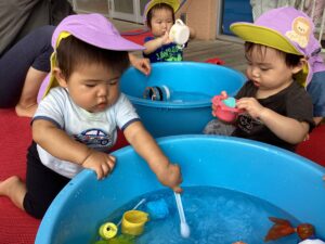 タライに入れた水をバシャバシャさせて遊んだり、、、