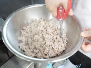 お肉は、幼児食用を炒めた後に、はさみで切って加えています。