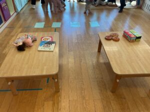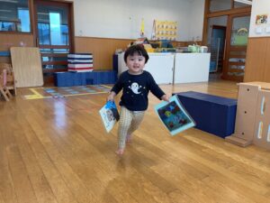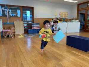 床に置いてあるカードをめくって、そこに描いてある物を持ってゴールを目指します!