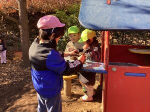 そしてうさぎさんの雪だるまを作りたかったことが年長さんに伝わり、「はい、うさぎのみみ!」と耳をひとつ作ってくれたのです!「ありがとう。」とお礼を言って嬉しそうに作る姿を見て、異年齢保育の素敵さを改めて感じました。