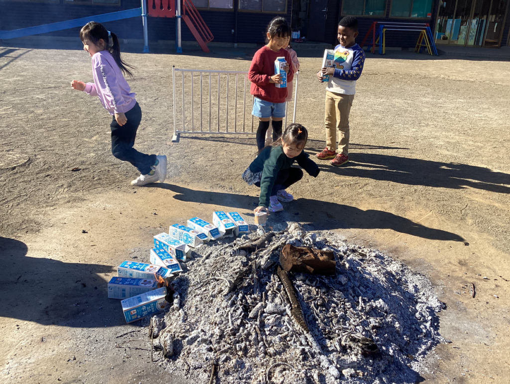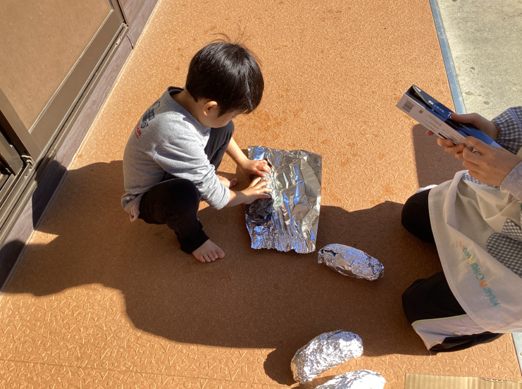アルミホイルで巻いたさつまいもを牛乳パックに入れて準備OK!!