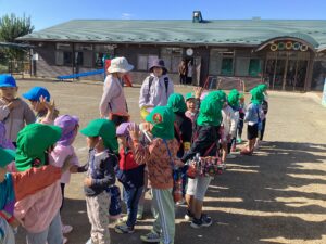 5歳児クラスの子が2歳児クラスの子と手をつなぎ、4歳児クラスの子が3歳児クラスのこと手をつないで歩きます。お兄さんお姉さんの力を借りて、長い距離を頑張って歩きました😊