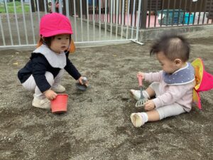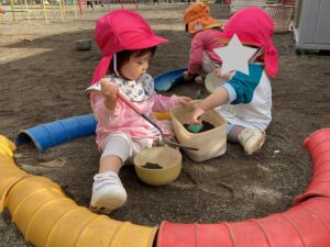 こちらは園庭での様子。砂あそびを楽しむ様子も増えてきました✨