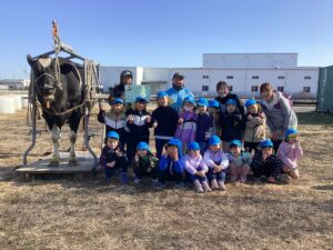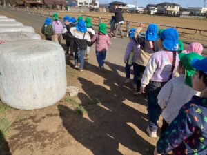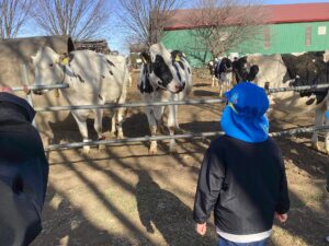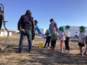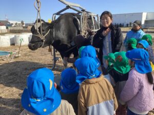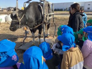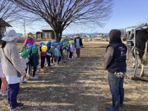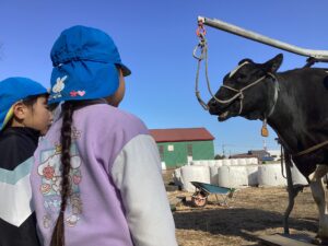 「牛さんから牛乳出るのかなぁ?」と興味深々の子どもたち。