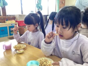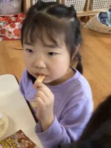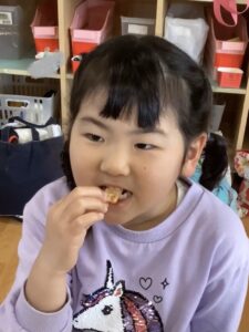 "おかき"に変身したおもちを味わい、益々おもちつきへの関心は深まった様子。