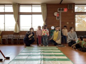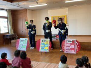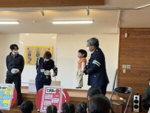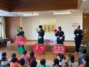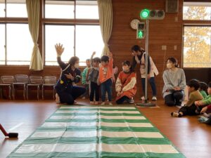手をしっかりあげて、右見て、左見て、もう一度右を見て、渡りましょう