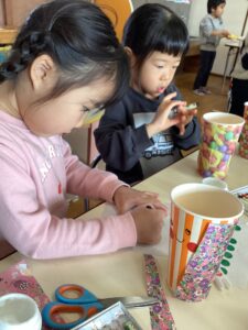 「私は紙コップでひな人形作ってるの」