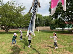 先日、散歩先の加藤牧場さんで大きなこいのぼりを見つけた子どもたち