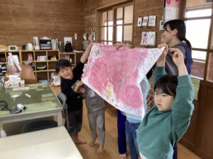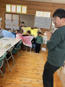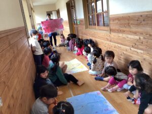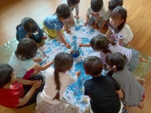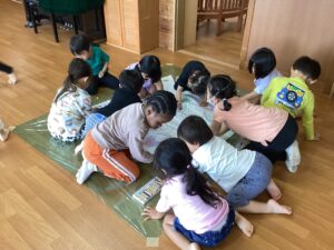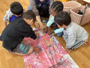 3〜5歳児の縦割りグループに分かれて絵を描いて