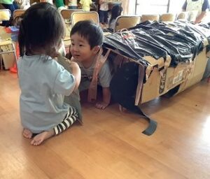 みんなで一緒に遊べるように、プウッと膨らむオバケのおもちゃや段ボール箱を繋げたトンネルも用意しました。