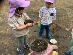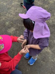 青組(年長クラス)に教えてもらいながらバッタを触ったよ