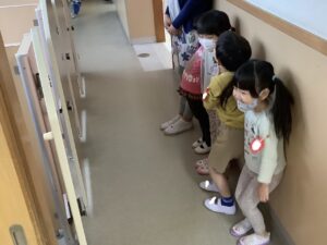 4歳児クラスのトイレにはドアが付きます。いきなり開けるのではなく「コンコンとノックしよう。」「壁の方で待とうね。」と話をしました。お兄さん、お姉さんのトイレに嬉しそうな様子です!