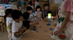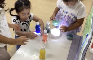下からライトを当ててみると…「わあ!きれい!!」 翌日は以前作っていた色水にも光を当ててみよう!と実験が始まりました。