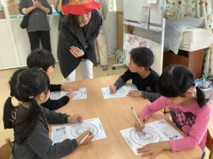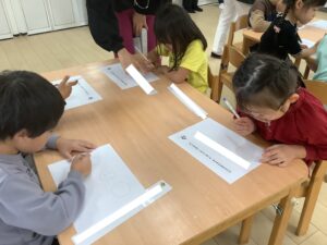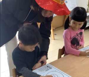 「こんな感じ!?」 「もう呪文覚えちゃった〜!」 えんぴつで書いてみよう!の前に…かっこいい椅子の座り方をしてみよう! 「お腹と机の間にグーが一個入るともっとえんぴつが上手になるよ〜!」 「はーーい!」 かっこいい座り方ができたら…えんぴつで書いてみよう!
