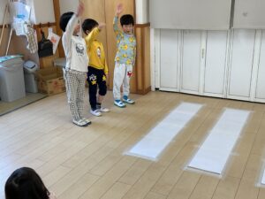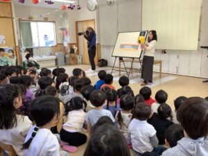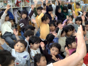 「手をあげて、みぎ、ひだり、みぎ!」 「みんな上手!車も来ていないかよく聞いてね!」 「はーい!」 続いて、交通安全クイズ!