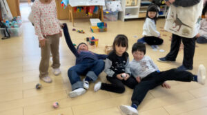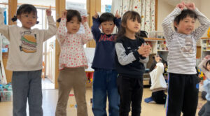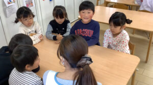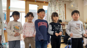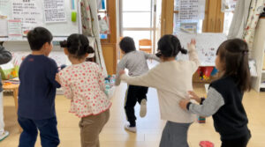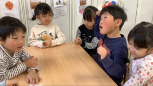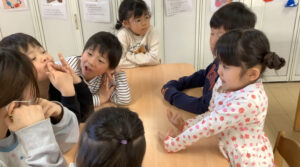 青組では年下の友だちに“鬼退治をしてもらいたい”という話が上がり、 そこで鬼退治会議を開きました! どんな会議になるかな!?「鬼に変身して〜お部屋にこっそり入って〜鬼だぞ〜!って するのはどうかな!?」 「それか〜歌を歌いながら入るのもいいかも!」 「鬼のパンツとか!?」 「うんうん!小さい子泣いちゃうかもだから歌にしよう〜!」