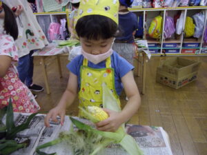 青組がおやつに出るトウモロコシの皮むきをしました。
