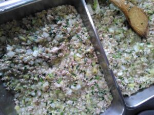 2.肉・野菜類をごま油で炒め、砂糖・醤油で味をつける。水溶き片栗粉でとろみをつけた後、あら熱をとる