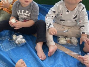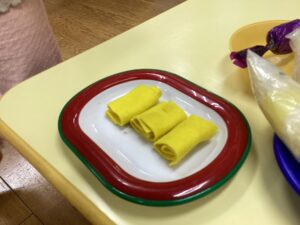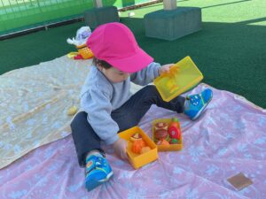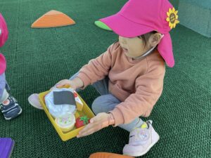 様々な素材を具材に見立てて、上手に詰めては保育者や友だちに届けています。