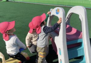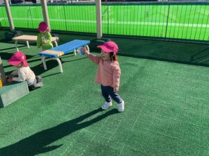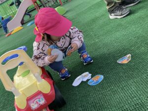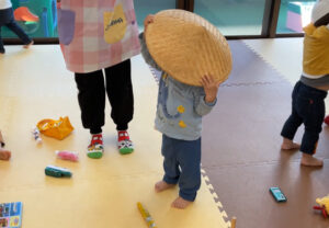 喜んですぐかぶる子、様子を伺いつつ触ってみる子と様々な楽しみ方でした。