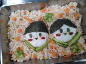 また、人参の残りを花形にかたどり、薄切りにした胡瓜で桃の花と着物の衿を再現しました。