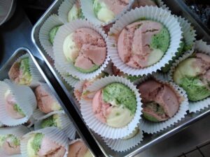 今回のおやつでは3色の意味を込めてプレーン・ほうれん草・イチゴの3つの生地で、ひし餅を再現した蒸しパンを作りました。