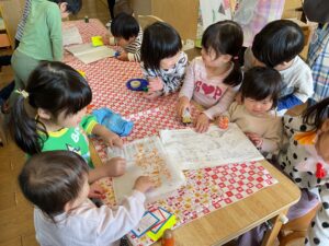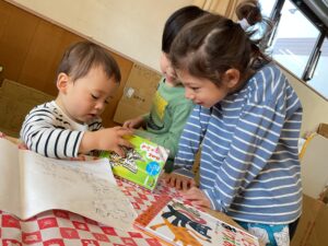 レストランには絵本コーナーもあって、好きな本を持ってくると一緒に見てくれました。