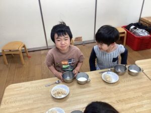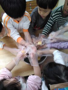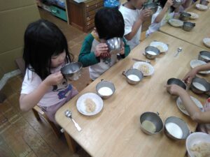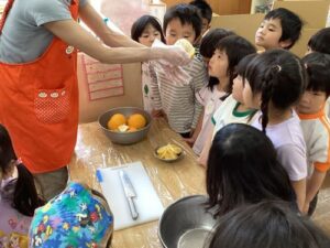 「わ、すっぱーい!」「ん~、すっぱい」想像より、すっぱかったのか顔がクシャっとなる子もいましたが、「けど、おいしいね」と自分たちで作ったミカンジュースに大満足でした。