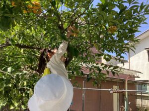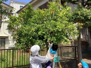 「上にあるミカンを採りたい!」と脚立や廃材を駆使して残っていた十数個の全てのミカンを、あお組の子どもたちが収穫しました。